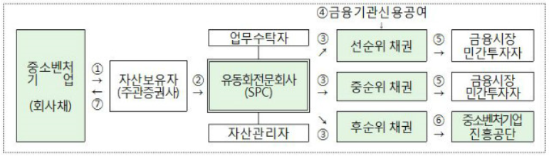 * 중소기업이 발행하는 회사채를 유동화전문회사(SPC, Special Purpose Company)가 인수한 후 이를 기초로 유동화증권(선ㆍ중ㆍ후순위)을 발행하며 선ㆍ중순위 증권은 민간에 매각하고 중소벤처기업진흥공단(이하 중소벤처기업진흥공단)은 후순위 증권을 매입하여 선ㆍ중순위 투자자들에게 안정성을 제공하고 중소기업들에게 많은 자금을 공급할 수 있는 구조
